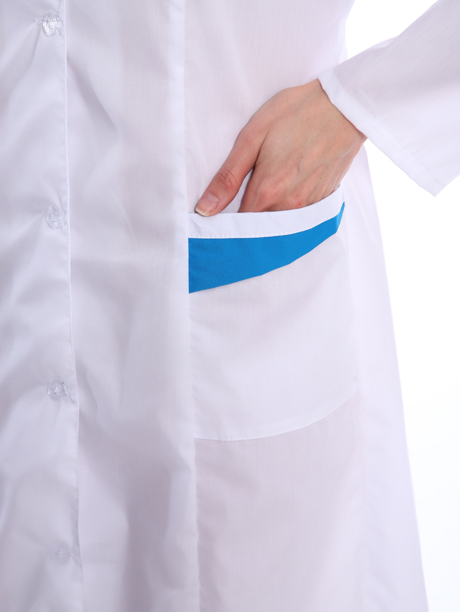 Халат женский с фигурной отделкой на лацканах и карманах, застежка на пуговицах, вертикальные рельефы. Ширина по линии талии регулируется хлястиком.