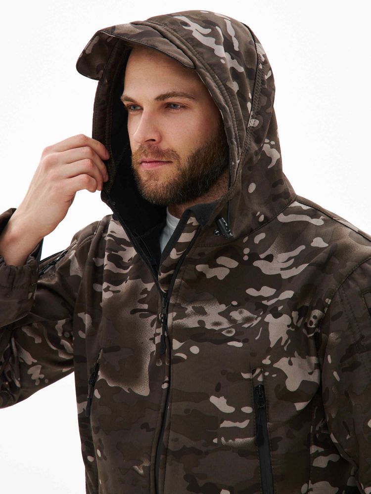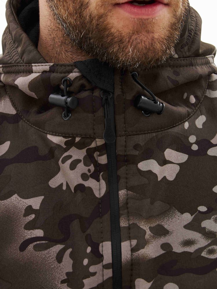- капюшон с козырьком и кулиской по лицевой части со шнуром резинкой и фиксаторами, утяжка кулисы капюшона происходит через нагрудные карманы;
