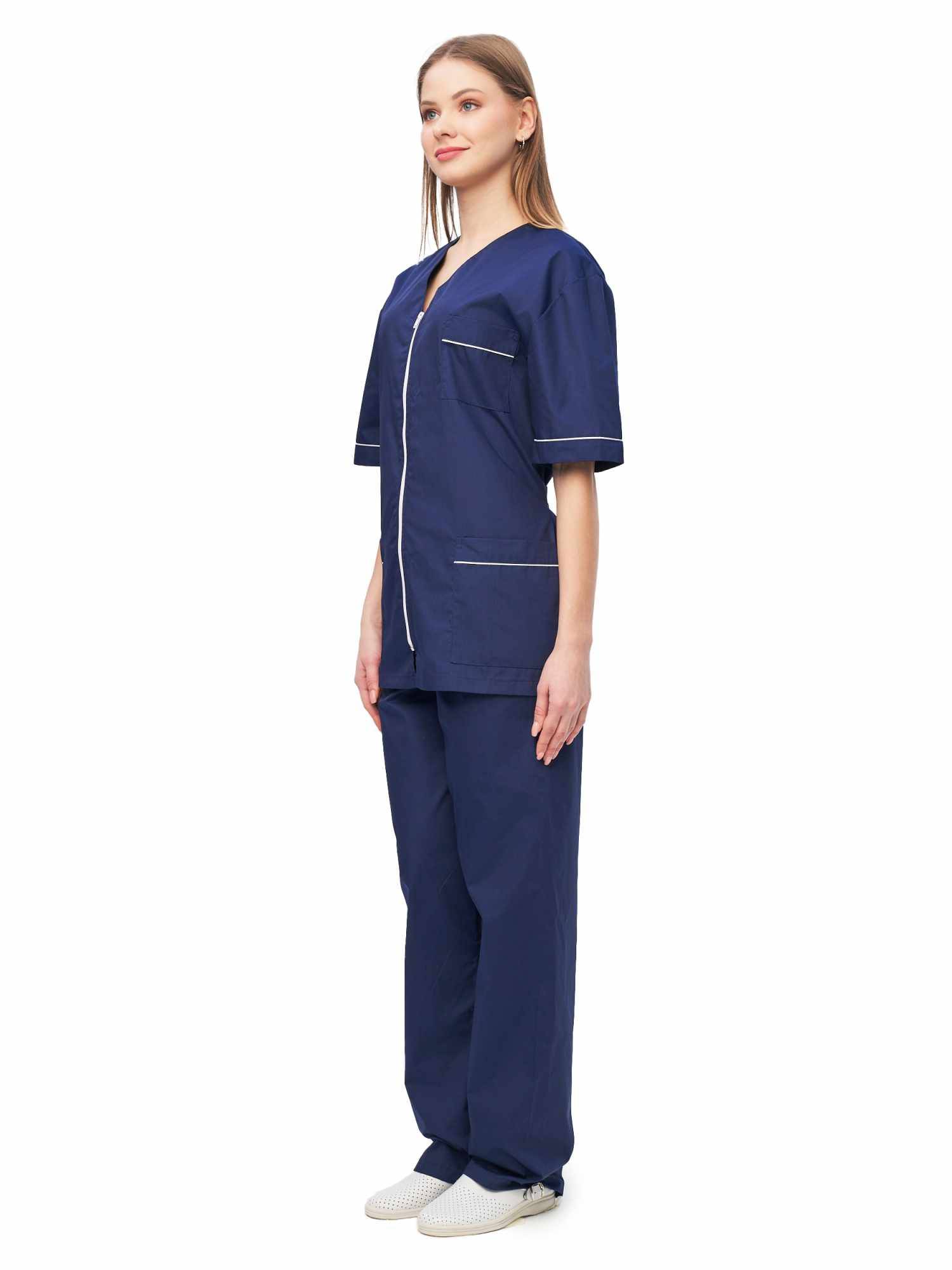 Современный удобный женский костюм со свободной посадкой, рекомендован для сферы косметологии и работников медицинских учреждений из высококачественной смесовой ткани прекрасно переносят многократные стирки и выглядят презентабельно даже при длительных сроках эксплуатации. Широкий размерный ряд продукции позволит без труда подобрать костюм правильно по фигуре, в соответствии со спецификой профессии и с учетом индивидуальных требований сотрудника. Костюм женский «Глория» для косметологов и медработников прост в уходе, не мнется и быстро сохнет, а материал долгое время сохранит свой первоначальный яркий цвет. Костюм состоит из блузы и брюк темно-синего цвета с белой отделкой. Сегодня современная мода вмешивается не только в подиумные и уличные образы. Она диктует свои правила разным сферам жизни, в том числе в сфере косметологии и медицине. Костюм состоит из прочной смесовой ткани ТИСИ, отталкивающей различного рода загрязнения. Материал устойчив к пятнам и истиранию, тем самым косметологи и медработники всегда будут выглядеть опрятно и привлекательно.